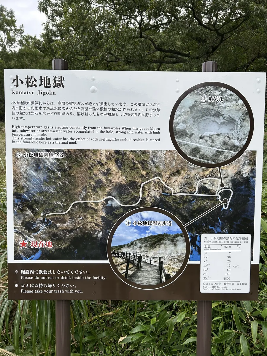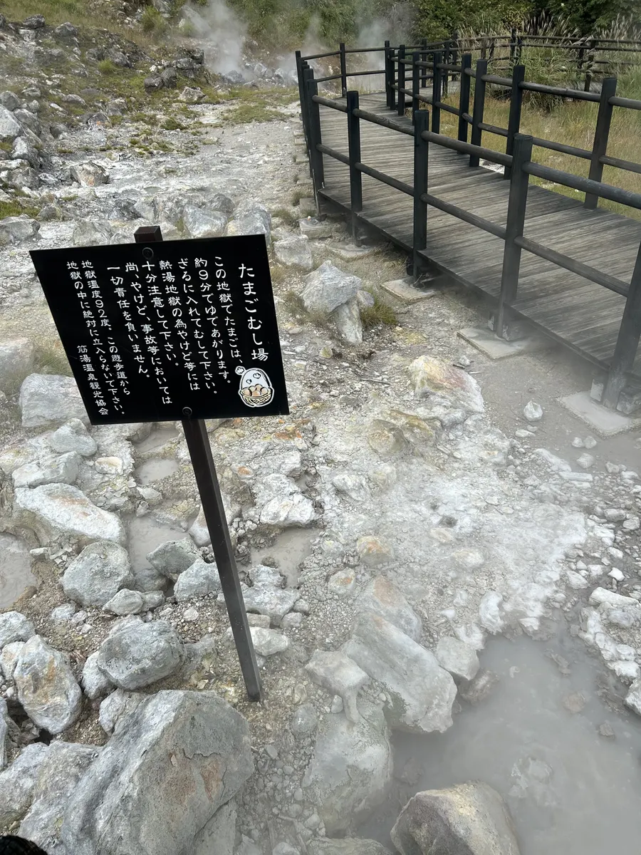 こちらは、小松地獄といい、筋湯温泉の泉源の一つ。あちこちで「シュー」とか「ゴボゴボ」とかいうてます。温泉たまごもでき、それ用のカゴも置いてあります。