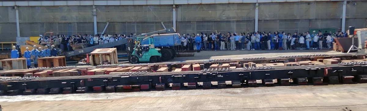 進水式は船を水に浮かべる作業の式典です。大型船の進水には船台進水とドッグ進水があり、式典の華やかさには随分と差があります。ドッグ進水は静かにドックに注水し浮上まで船は全く動きません。浮上後も静かにドック外に曳航されます。一方、船台進水は船体が船台を滑り降りて勢いよく海に出ていきます。この勢いを止めるのにも色々工夫がされています。式典の華やかさは船台進水に軍配です。