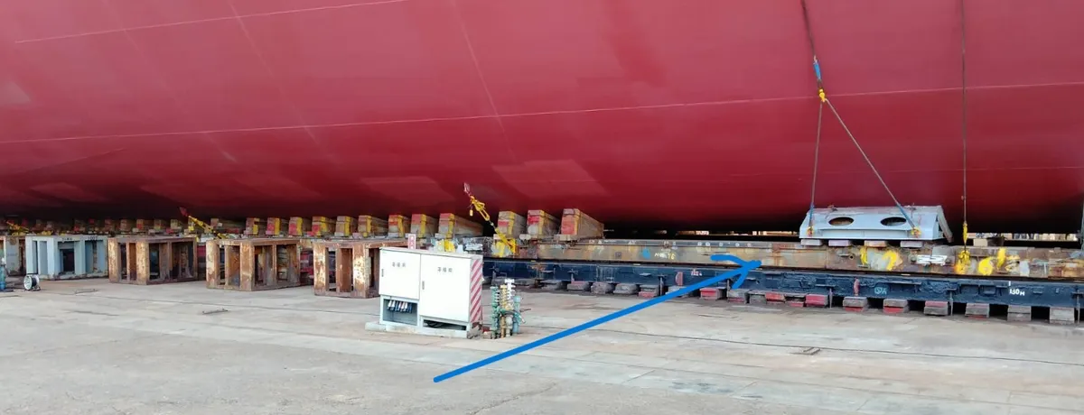 進水前、船底は盤木で支えられていますが、その下は滑走台(すべり台)と進水台(固定台)です。矢印の上側が滑走台、下側が進水台です。滑走台は船体と一緒に進水することになります。
