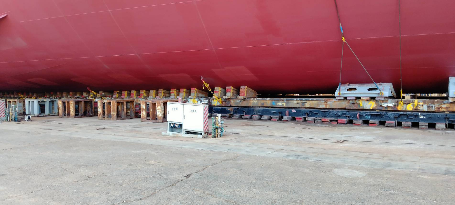 この滑り降りて行く方法にまた二通りあります。「滑り」と「ころがり」です。今回の三菱下関はころがり進水です。
