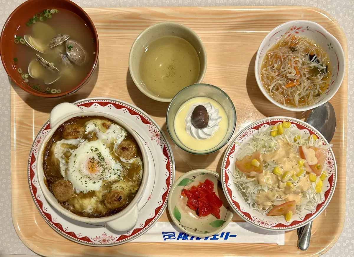 北九州名物の焼きカレー(また食べてる)、野菜サラダと春雨サラダ、貝汁、しおかぜプリン🍮。最高すぎます😋😋