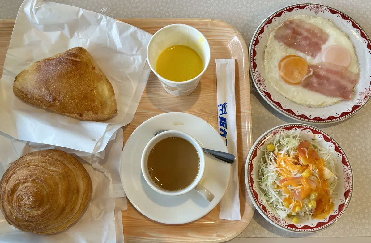 パンにしました。実は前夜から予約していた「焼きたてパン」。阪九フェリーさんの名物です✨こちらもまた美味い😋 気分上々👍