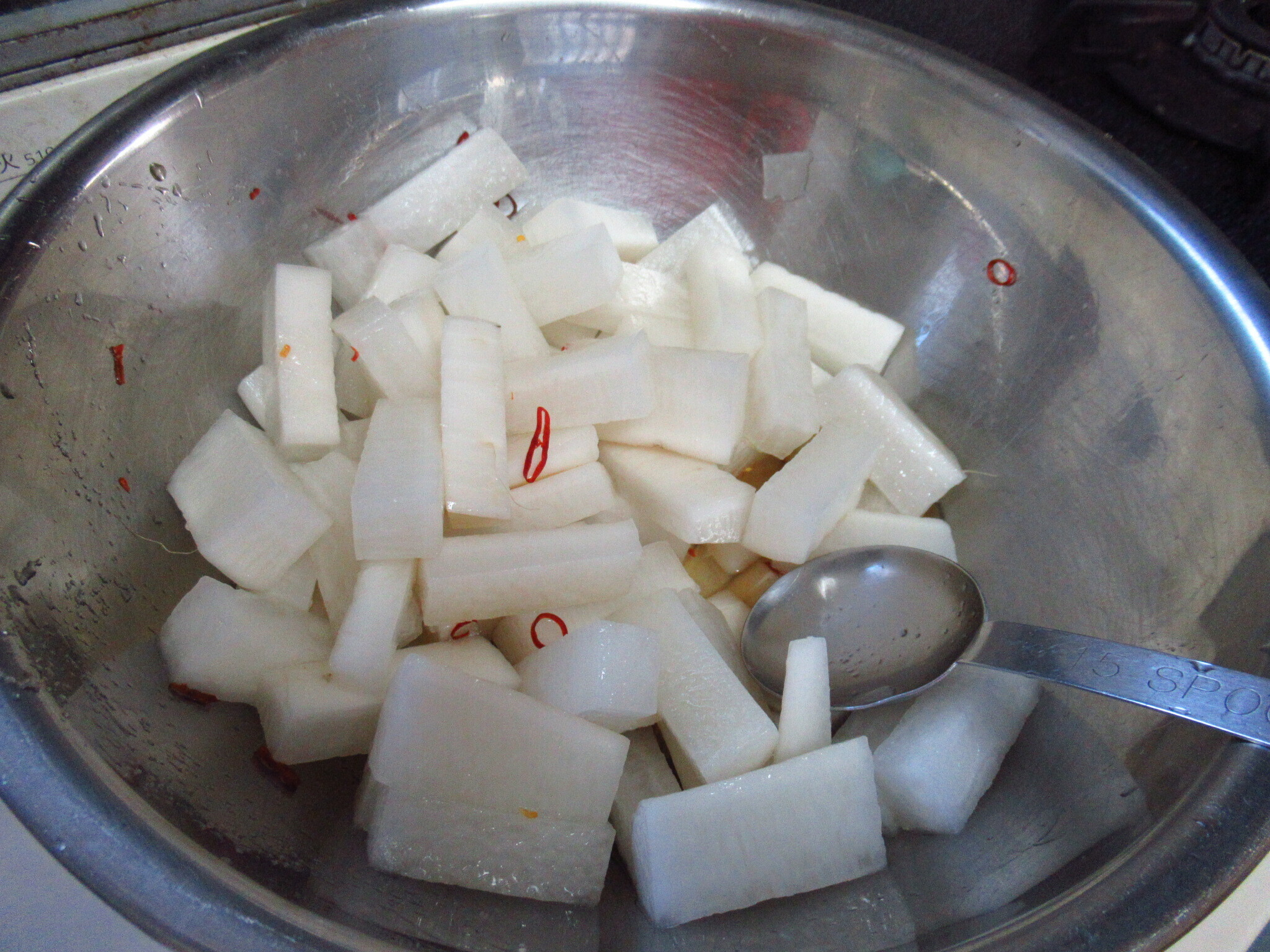最近暖かい日も増えてきたがまだまだ大根が美味い。おでんに入れてよく染みた大根も美味いし、豚バラと煮てもこれまた美味い。もちろん生のままチリメン大根おろしで朝食にもよく登場する。最近よくわが家で作るのは『大根のポリポリ漬け』。良く洗った大根を皮のまま適当な長さの太めの短冊に切る。漬けタレは砂糖、塩、酢、みりん、輪切りタカノツメのみ。大きめのボウルにタレを作り、切った大根を投入してよく混ぜ、あとはタッパーに入れて2~3日冷蔵庫で寝かすだけ。歯ごたえのある漬物が簡単に完成。わが家では夕食の一品に欠かせない。今回も太い大根約700gで作りました