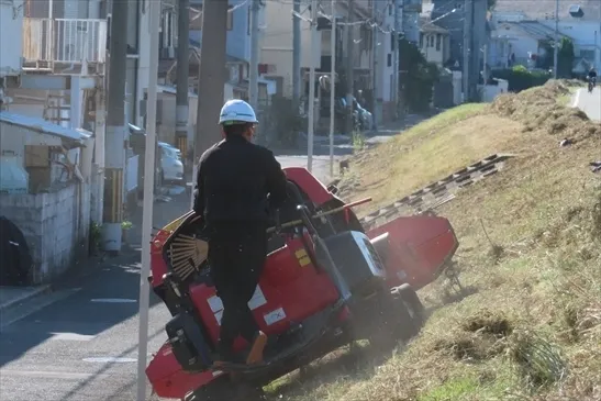 大和川土手の草刈り作業 急斜面も何のその 刈っていく素晴らしい安定感で刈っていく