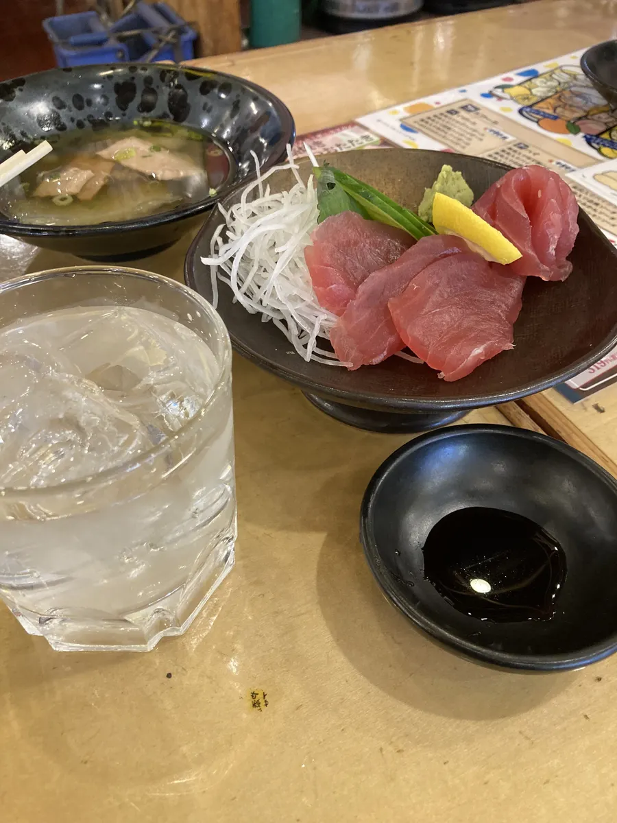 せんべろでは物足りないので、焼酎ロックとマグロ刺身を追加