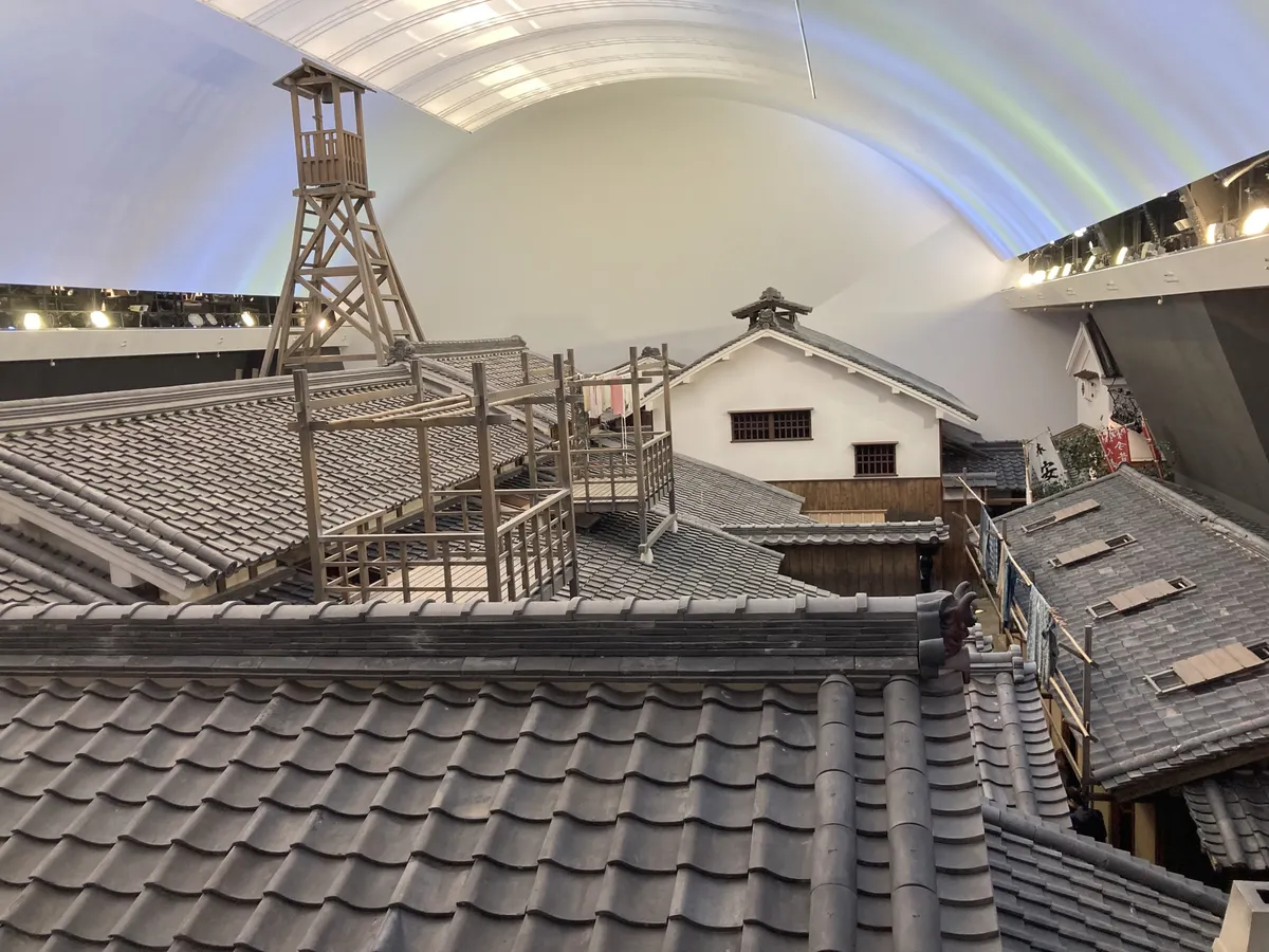 天神橋筋商店街の入口にあるビルの9階には実物大で再現された江戸時代の大坂の町並みが再現されていて、本物そっくに町家や町人長屋が軒を連ねる。まるで江戸時代にタイムスリップしたような気分。昼間の町並みにはやがて夕立や雷が鳴り響き、その後夕焼けに染まり、やがて夜空に月が輝く。