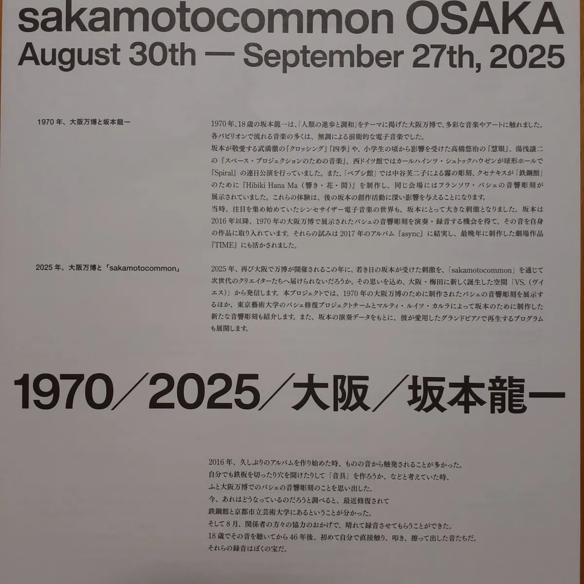 トップ > ファンでん写真館 > 今日の暮らしの一枚 > sakamotocomon OSAKA はる 2025/09/20 22:21 sakamotocomon OSAKA うめきたで開催中の坂本龍一さんの展示に行って来ました。 18才の時に見た大阪万博で、多彩な音楽やアートに触れたそうです。(各パビリオンから流れる電子音も) 1970年万博で展示されたバシェの音響建築やそれを演奏する坂本龍一さんの映像など。 坂本図書の分室があり、生前読まれていた本が並んでいて手に取ることが出来ました。文学哲学洋書等多岐にわたる。 またアーカイブのコーナーには、学生証や自筆のノートや楽譜、1970年万博のチケット等も。 坂本龍一 うめきた VS. いいね 共有する 共有する X facebook LINE リンクをコピー コメントする 1 件の返信 (新着順) ミュートしたユーザーの投稿です。 投稿を表示 さいちゃん 2025/09/22 10:24 素敵かつとても貴重な展示会ですね! とても行きたくなりました。冬にはドキュメンタリー映画が公開されるみたいです! いいね 返信する ミュートしたユーザーの投稿です。 投稿を表示 はる 2025/09/22 17:12 さいちゃん コメント有難うございます。 まだどこかで生きていらっしゃる錯覚に陥りました。うめきたのVS.で27日迄ですので、お時間が合えば是非。 いいね 返信する