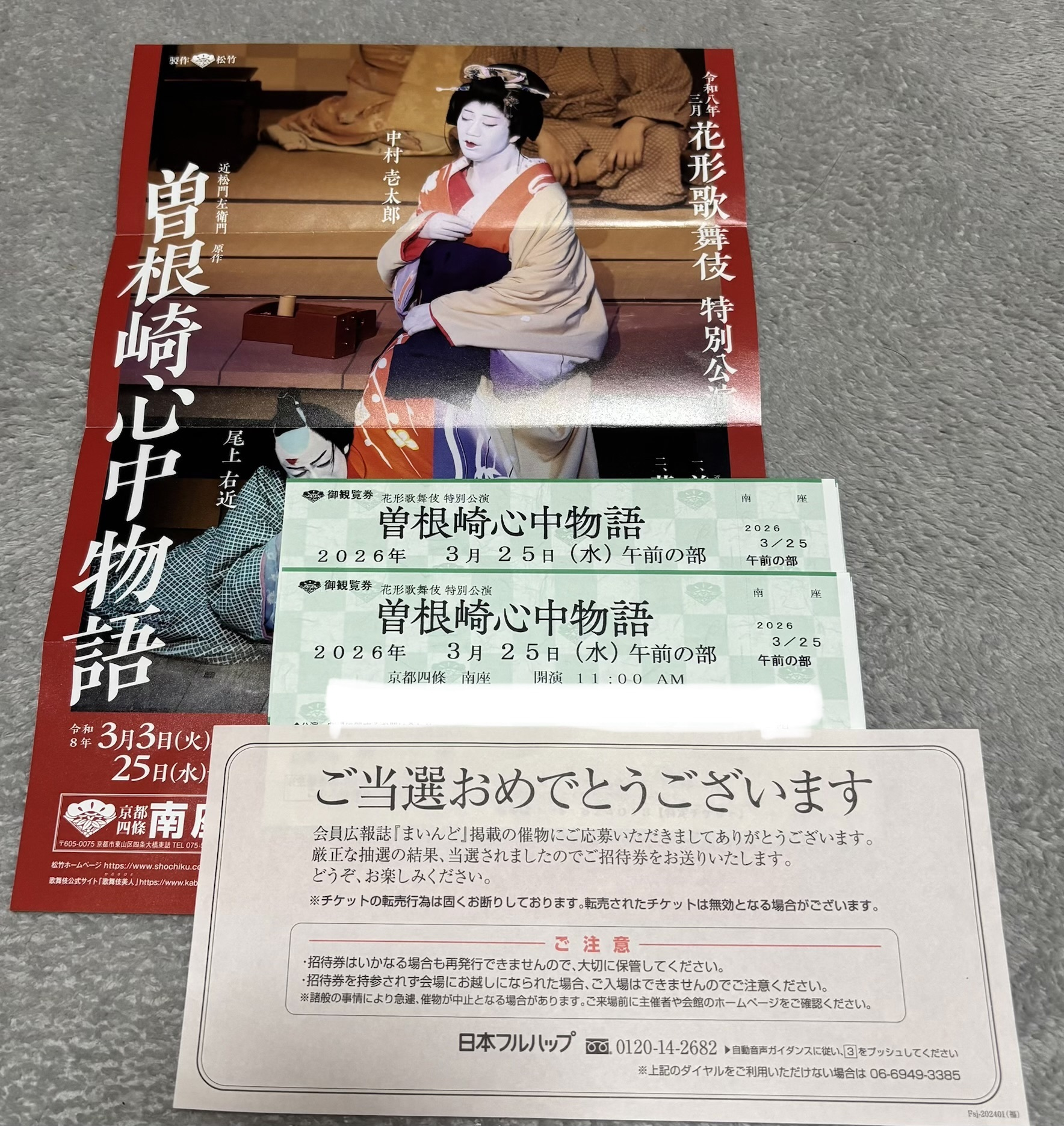 フルハップの懸賞で、結構歌舞伎があるので、それで当たれば行こうと言うてて、申込したらあっさり当選🩷