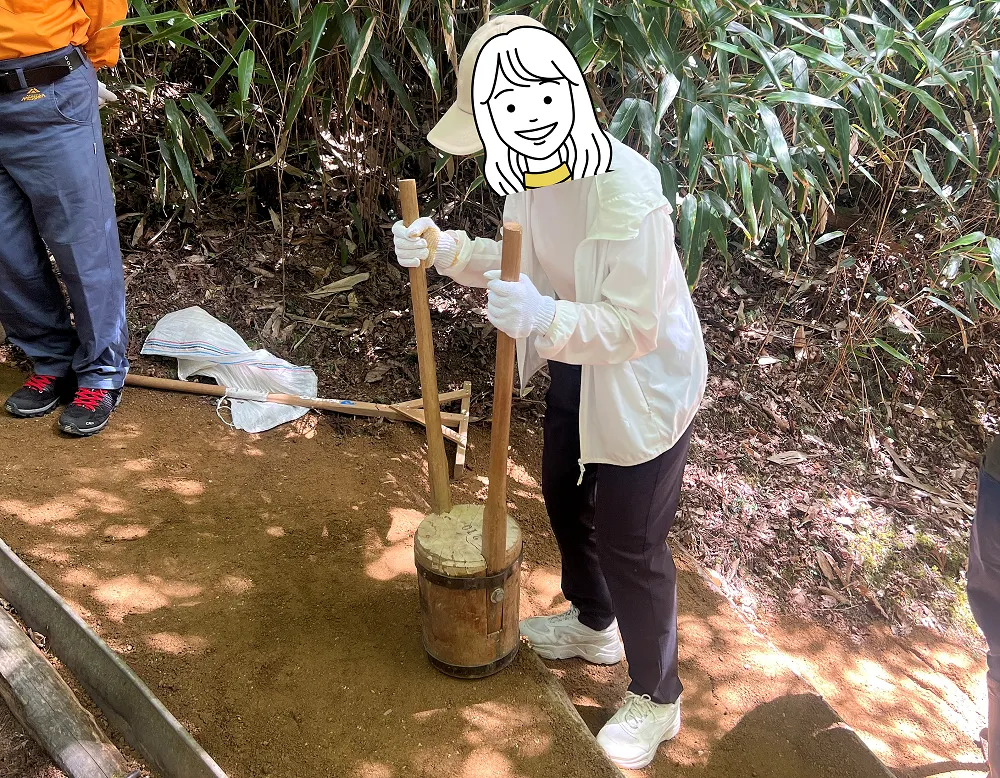 修繕に使う土を運び、木製の道具で地面をならすのですが、想像以上に道具が重い!💦