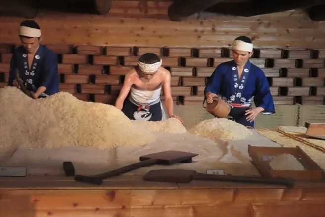 蒸した米に麹菌を振りかけ混ぜる作業の風景模型