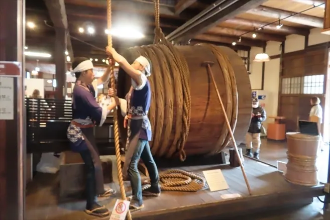 白鶴酒造では昔の酒造りを人形で再現 リアル! 大きな樽を滑車で引き上げる