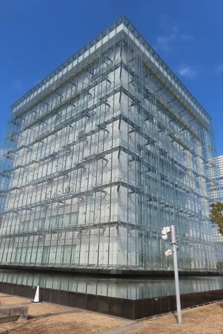 全面ガラス張りの建物で東日本大震災の津波の高さやマグニチュードが外壁に記されていた 地震などについて広く学べる施設で多くの中学生が見学に来ていた