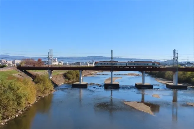 下高野橋から望む近鉄大和川橋梁 特急が通過していく