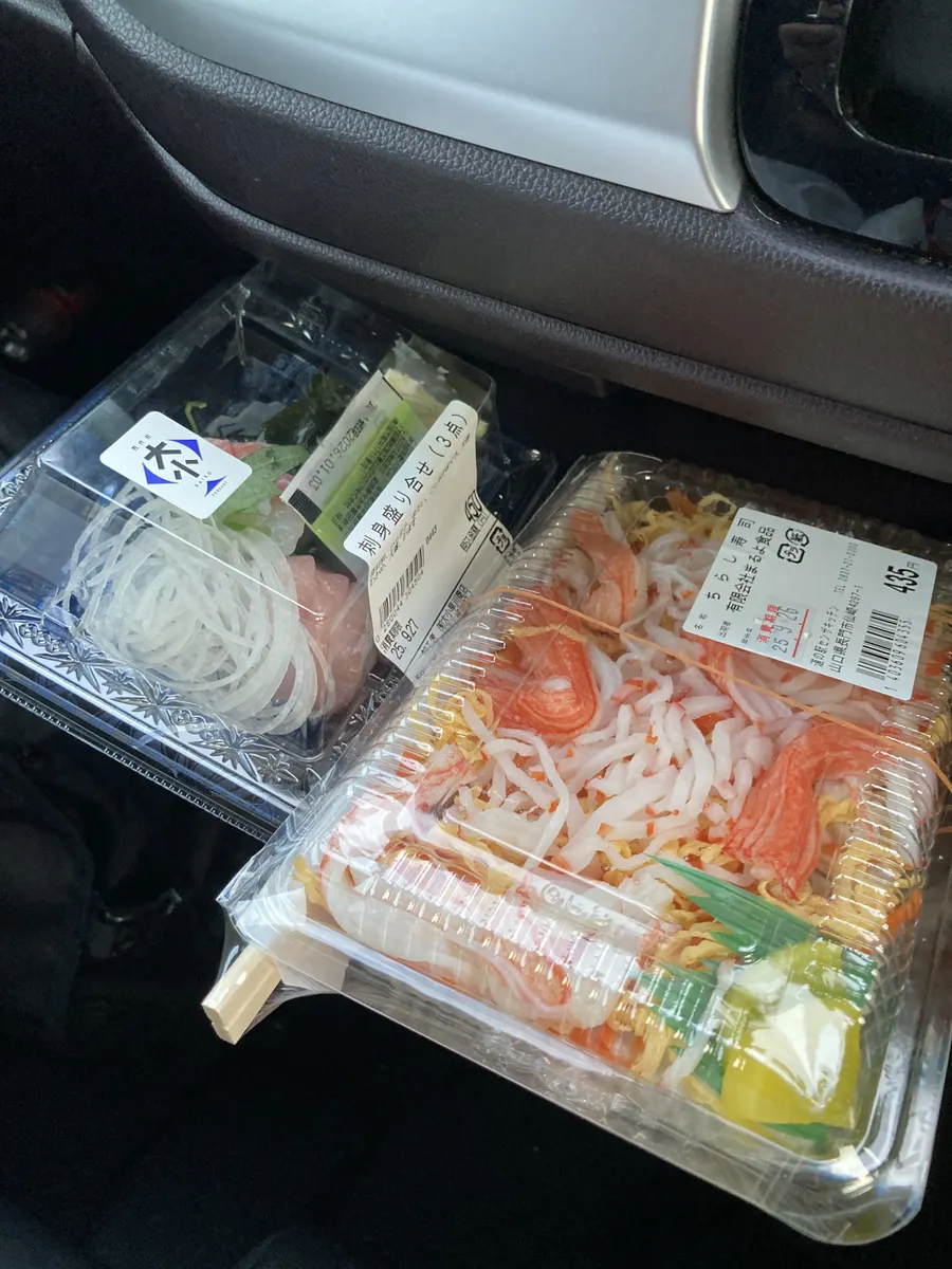 晩メシ 道の駅で購入したちらし寿司と刺身盛り合わせ。お酒もふぐ皮ポン酢もあります。