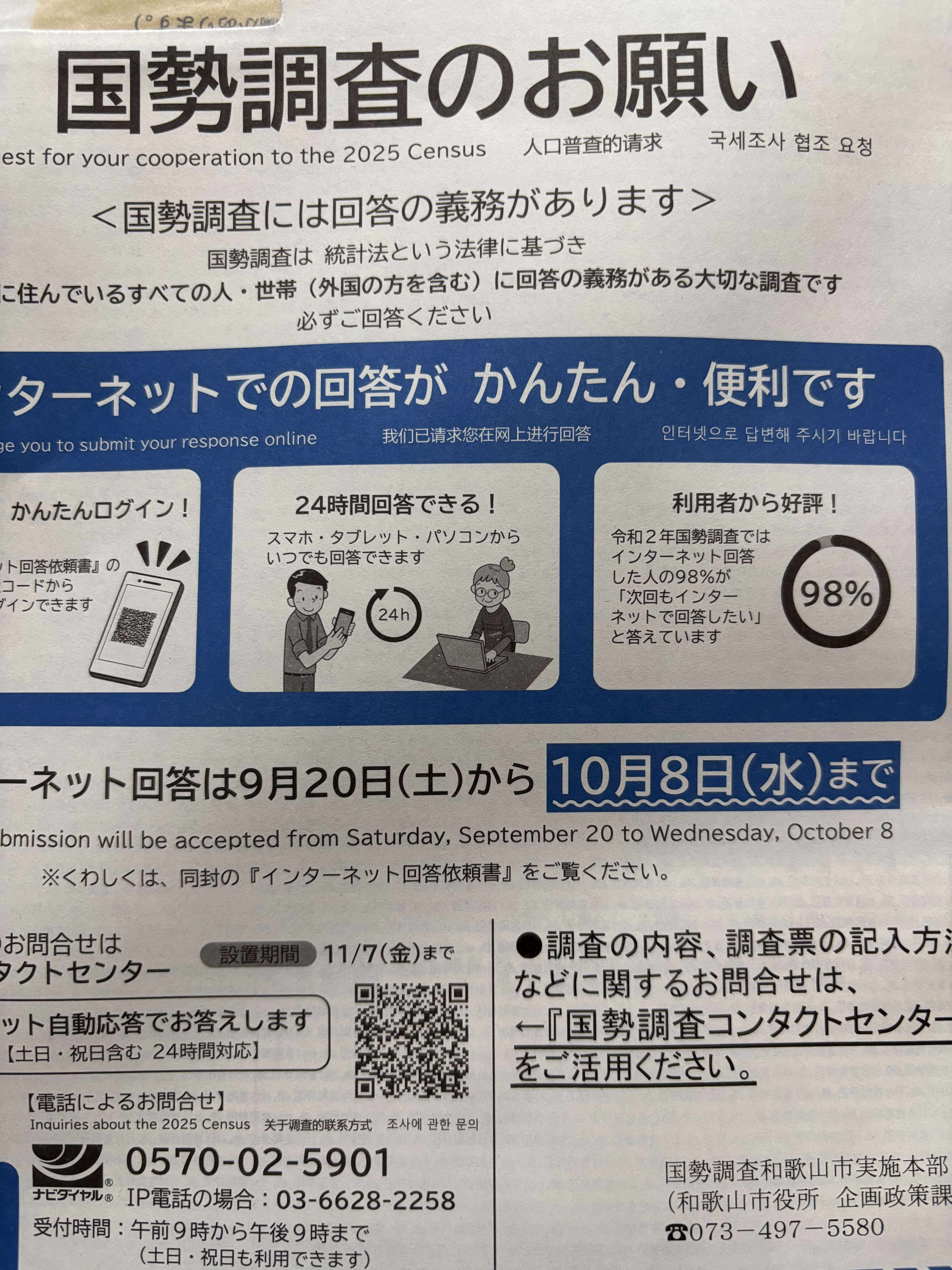 投稿を表示国勢調査。書類何もきていなかったのですっかり忘れていたので、まつかよさんの投稿をきっかけに市町村のホームページを確認して予習しておきました。9月20日から訪問開始、とあったのでポスト等よく確認しておこうと思います。(不在票など、)