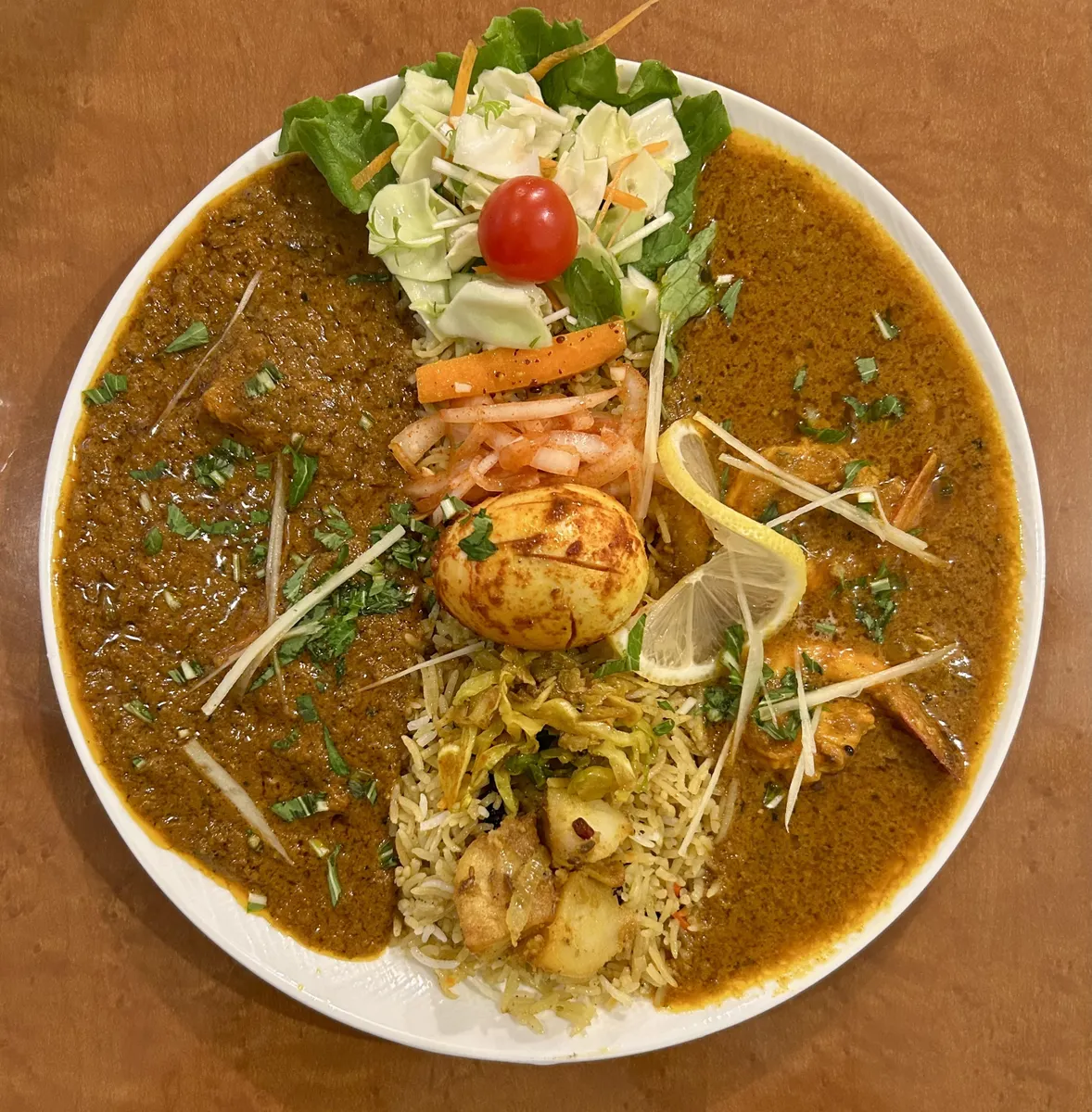 真ん中に載っかるのはスパイスたまご。あと、カチュンバルというサラダと、サブジ(おかず)はジャガイモ。ニンジンのアチャールもございます♪