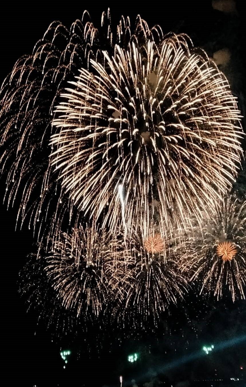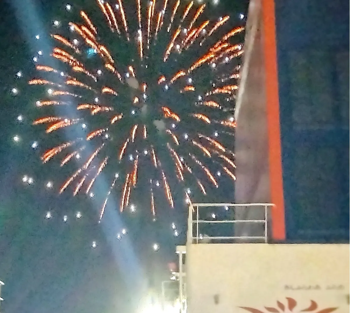 「さんふらわあ」に係留中から乗船しての鑑賞でしたが、花火鑑賞には方向的に難しいものがありました。展望デッキは船体後部だけなので、船の構造物越しに前方を観る事になってしまいます。