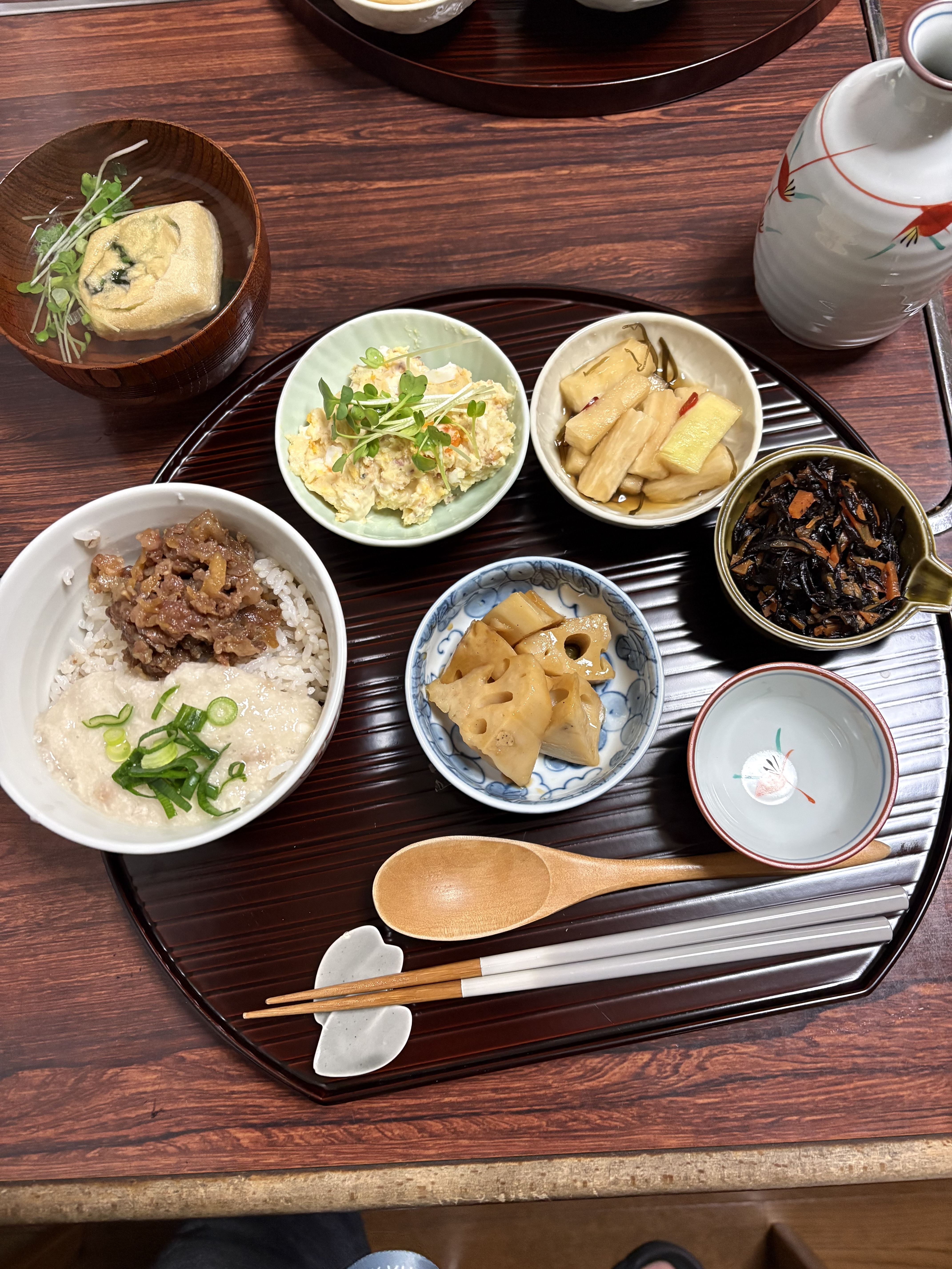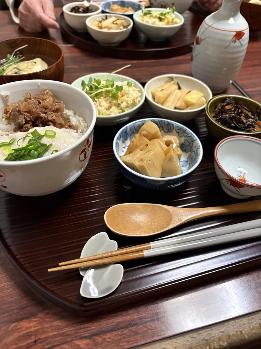 トップ > ファンでん写真館 > 今日の暮らしの一枚 > 普段の晩メシをちょっとお洒落に! カタツムリ 2026/02/02 18:33 普段の晩メシをちょっとお洒落に! 今日は車の法定点検。作業時間2時間。ディーラーで読書タイム。 晩メシは数種類の常備菜を小鉢に盛ってみた。 主菜は牛肉しぐれ煮の麦とろろご飯。もち麦飯に牛しぐれ煮と長芋とろろを盛る。小鉢の副菜はピリ辛れんこん、大根の塩昆布漬け、ひじきの含め煮、和風ポテサラ、おすまし。 和風ポテサラはマヨネーズにポン酢、かつお節、ゆで卵が入ったポテサラで結構美味い。 主菜、副菜を半月盆にのせてみたら嫁さんがえらく喜んでくれました😙 麦とろご飯 牛肉しぐれ煮 和風ポテサラ 半月盆 いいね 共有する 共有する X facebook LINE リンクをコピー コメントする 2 件の返信 (新着順) ミュートしたユーザーの投稿です。 投稿を表示 ことこつめ 2026/02/03 19:15 カタツムリさんの、料理を見るのが毎回楽しみに、してます。 いいね 返信する ミュートしたユーザーの投稿です。 投稿を表示 カタツムリ 2026/02/03 19:55 ことこつめ うれしいお言葉、ありがとうございます! とにかく作って食べるのが好きです もちろん外飲みも大好きでが・・😋 3分クッキングや今日の料理、新聞のレシピ欄を絶えずチェックしてます いいね 返信する ミュートしたユーザーの投稿です。 投稿を表示 こかた 2026/02/02 19:48 カタツムリ お店で食べてるみたい😊 いいね 返信する ミュートしたユーザーの投稿です。 投稿を表示 カタツムリ 2026/02/02 19:54 こかた ありがとうございます! 嫁さんも同じ感想でした 永らく使ってない半月盆を引っ張り出してきました😙 いいね 返信する