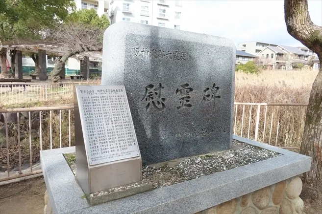 13:24 宝島池公園の阪神淡路大震災慰霊碑 合掌