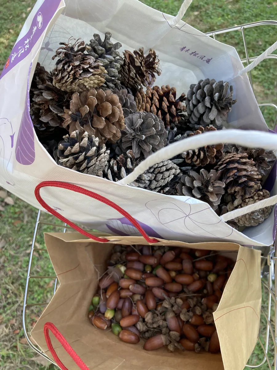 袋いっぱいの松ぼっくりとどんぐりを集めた