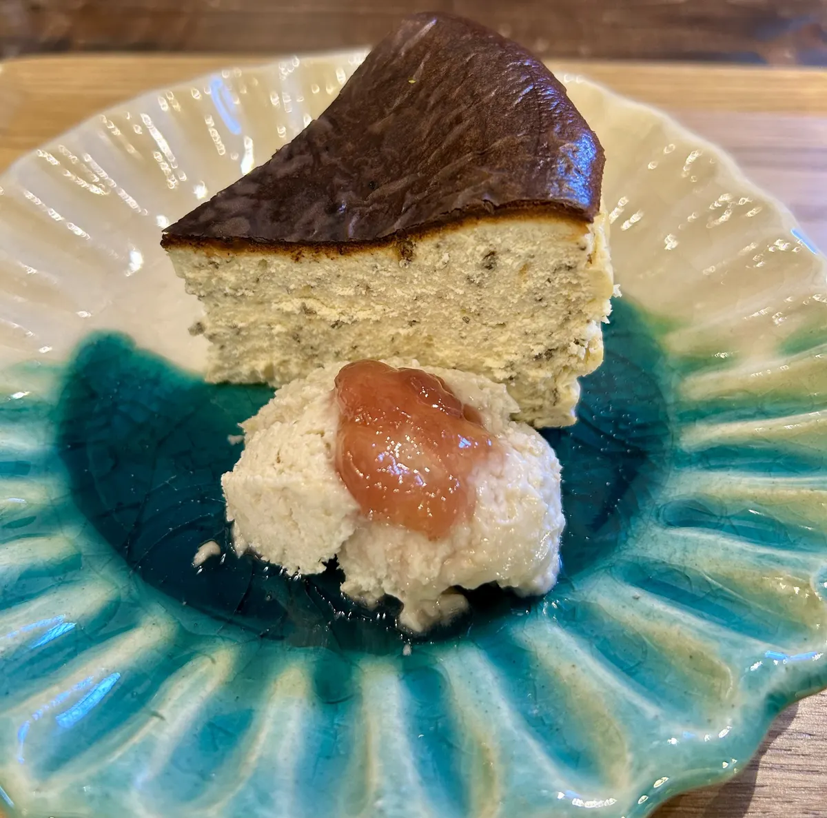 バスクチーズケーキには糀を使ったアイスクリームが添えられ、バスクチーズケーキと一緒に食べるともう幸せ。そしてコーヒーといただくとさらに幸せ😃😃。