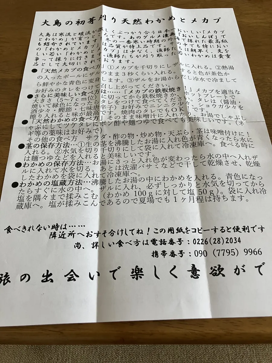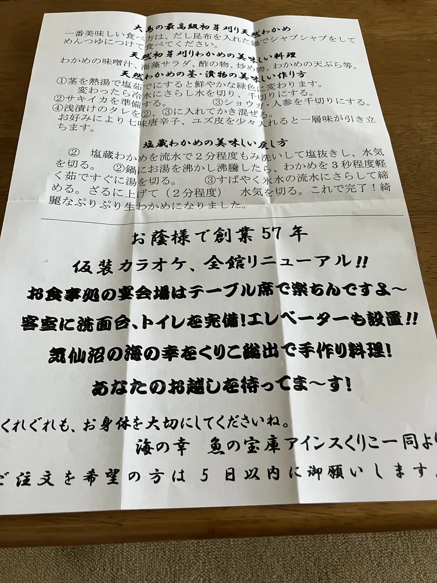 去年9月に気仙沼ちゃんの宿「アインスくりこ」に宿泊し、ファンでんにも投稿しました。とても良かったので、また行きたいねとは思っていたのですが、なにせ東北なので遠い! そのような時、ヤマトからのお荷物お届けのメールが、品名が生ワカメ? 頼んでないぞって思ったのですが、送り主を確認すると、納得。このようなサービスというのは考えもしていなかったので、改めて愛されてリピーターの多い宿だと実感しました。
