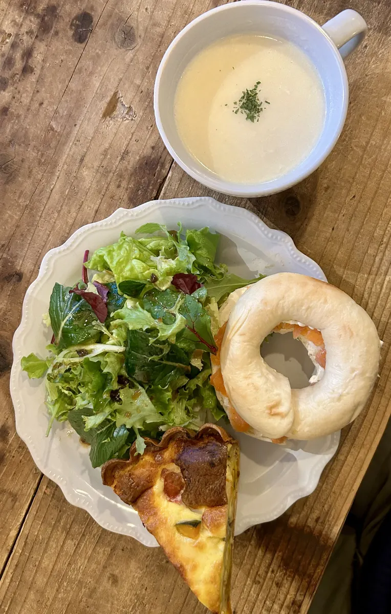 いただいたのは、ベーグル・キッシュプレート。ベーグルはサンドイッチとなっていて、私はサーモンとクリームチーズにていただきました😋 あと、ジャガイモと玉ねぎの自家製ポタージュを付けていただきました😋