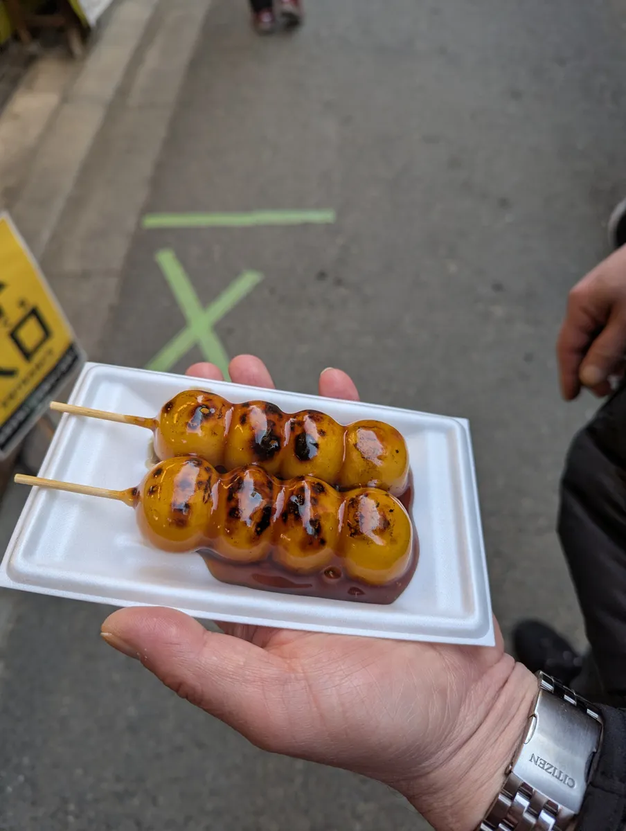 お参り後、参道からの商店街で焼きたてのみたらし団子を食べ、山椒の実も購入。
