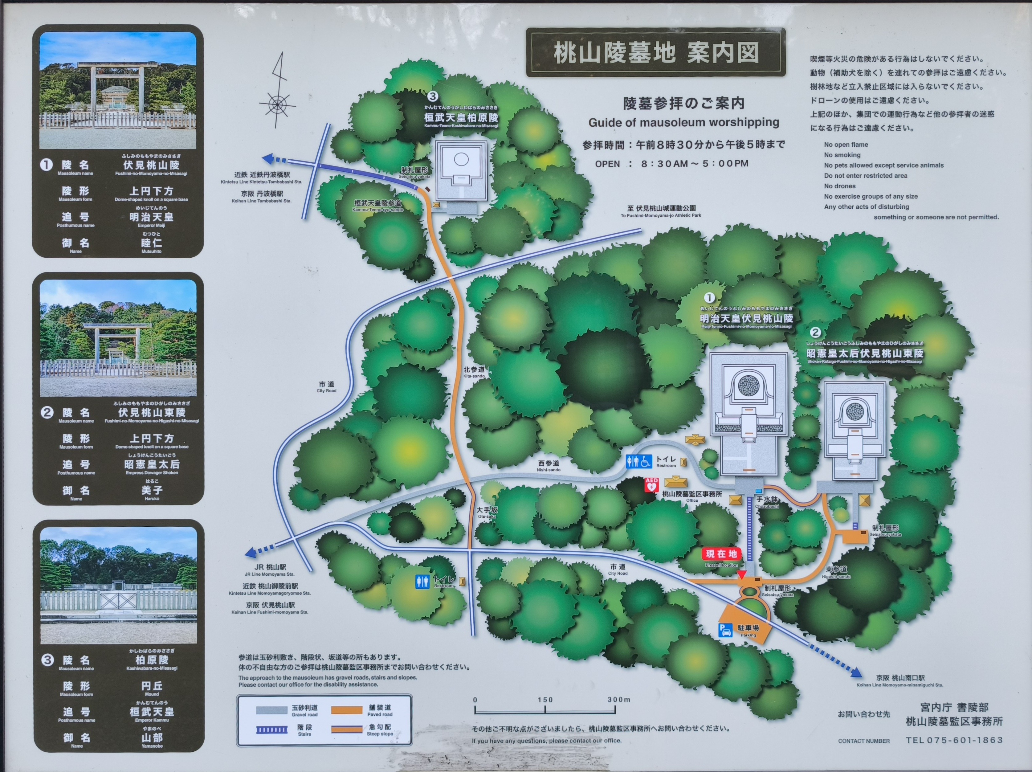 こちらには、桓武天皇、明治天皇、昭憲皇太后の陵墓があります。