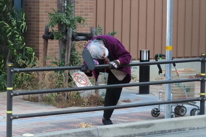 身体柔らか~い😁 道路のガードレールでひとり黙々と柔軟運動をするおばあちゃん