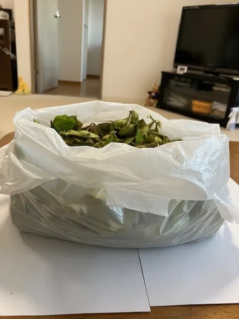 2株を注文して、収穫体験した黒枝豆量が凄いと思いませんか?1株の意味が良く分からなくて、でも十分かなと思ったので、帰ろうとするとスタッフの方が少ないからと、株を切って下さったのですが、1株って滅茶大きい! 私が切ったのは2枝だったんだ。沢山持って帰って下さいと言ってくれたので、黒枝豆を必死で枝から外し、最後にバケツからビニール袋に移し替え持って帰ったのが、この量です。食べきれない量なので、どこかにおすそ分けを考えています。因みに1株600円です。