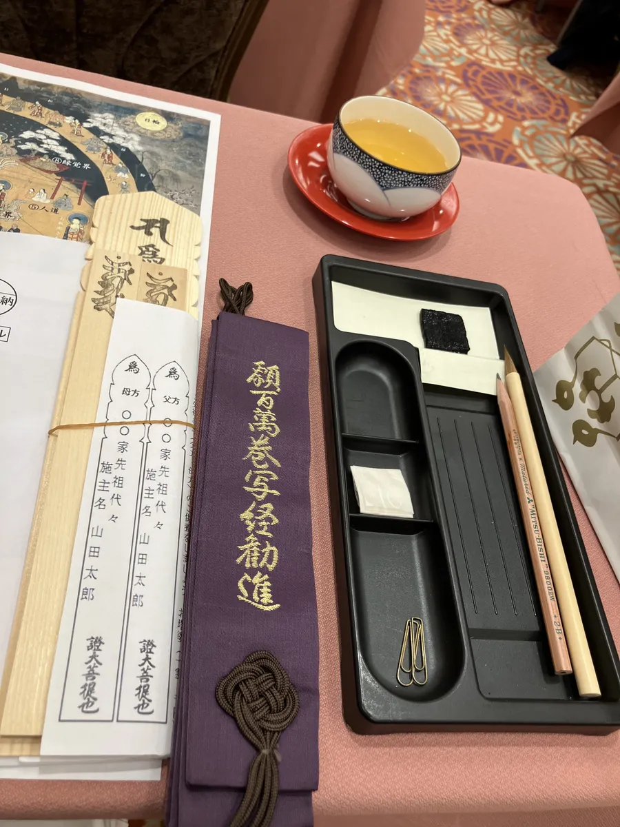 筆が入っている入れ物の左側においている和袈裟を首から掛けて、無の境地でお写経をして来ました^_^