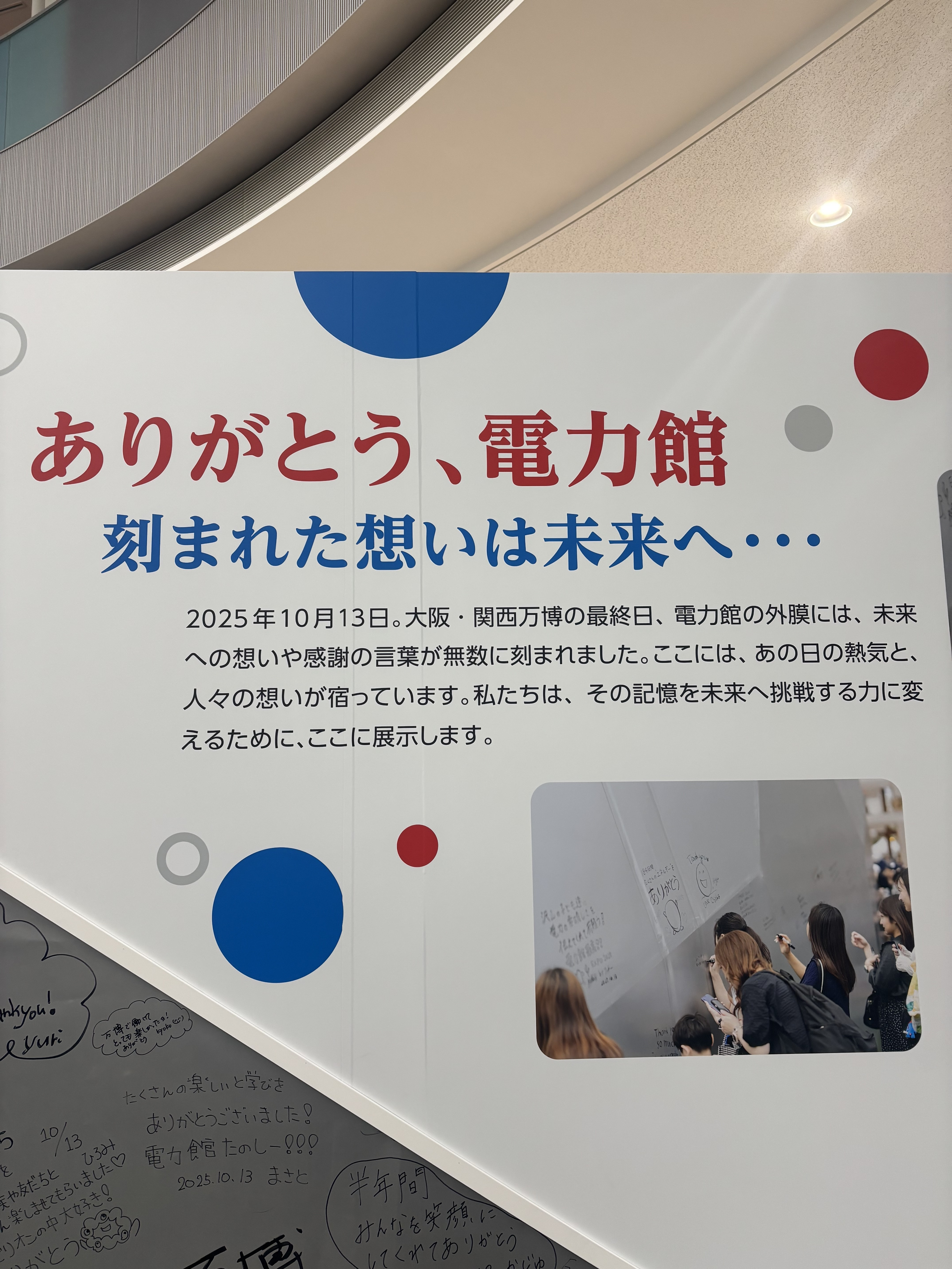 トップ > ファンでん写真館 > 今日の暮らしの一枚 > ありがとう電力館 さいちゃん 2025/12/24 13:59 ありがとう電力館 行ってきました! 平日にも関わらず結構たくさん来られてました。 やっぱスタンプ、皆さん押して帰られてますね! 写真は、万博の最後に電力館の外壁にメッセージの書き込みをしたものを移設されたようです。 いろんなメッセージがあり、たちどまって読みましたが、色々と思いだされました。 あらためてありがとうございました! と伝えたいです。 いいね 共有する 共有する X facebook LINE リンクをコピー コメントする 0 件の返信 (新着順)