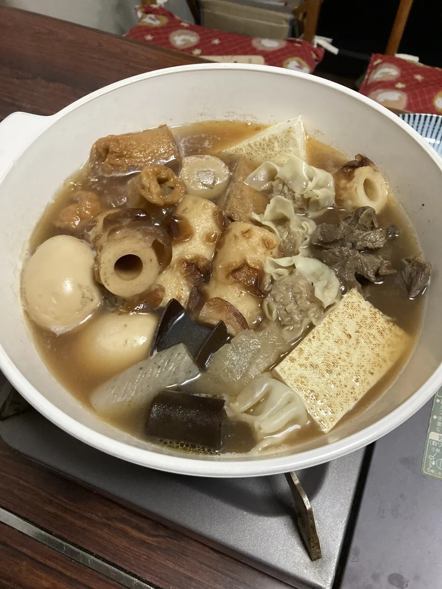 トップ > ファンでん写真館 > 今日の暮らしの一枚 > 今夜はおでん🍢 カタツムリ 2025/10/25 18:30 今夜はおでん🍢 日中は暑い暇あるが朝夕はめっきり寒くなった。寒くなったら「おでん」。朝から具材を煮込む。 わが家の具材の基本形は牛すね肉、大根、こんにゃく、厚揚げちくわ、ごぼう天、卵。あとは食卓でシューマイや焼き豆腐を加えて煮込みながら食べる。日本酒を忘れずに冷やしておこう! 今夜のおでんも美味しかったなあ! おでん いいね 共有する 共有する X facebook LINE リンクをコピー コメントする 0 件の返信 (新着順)