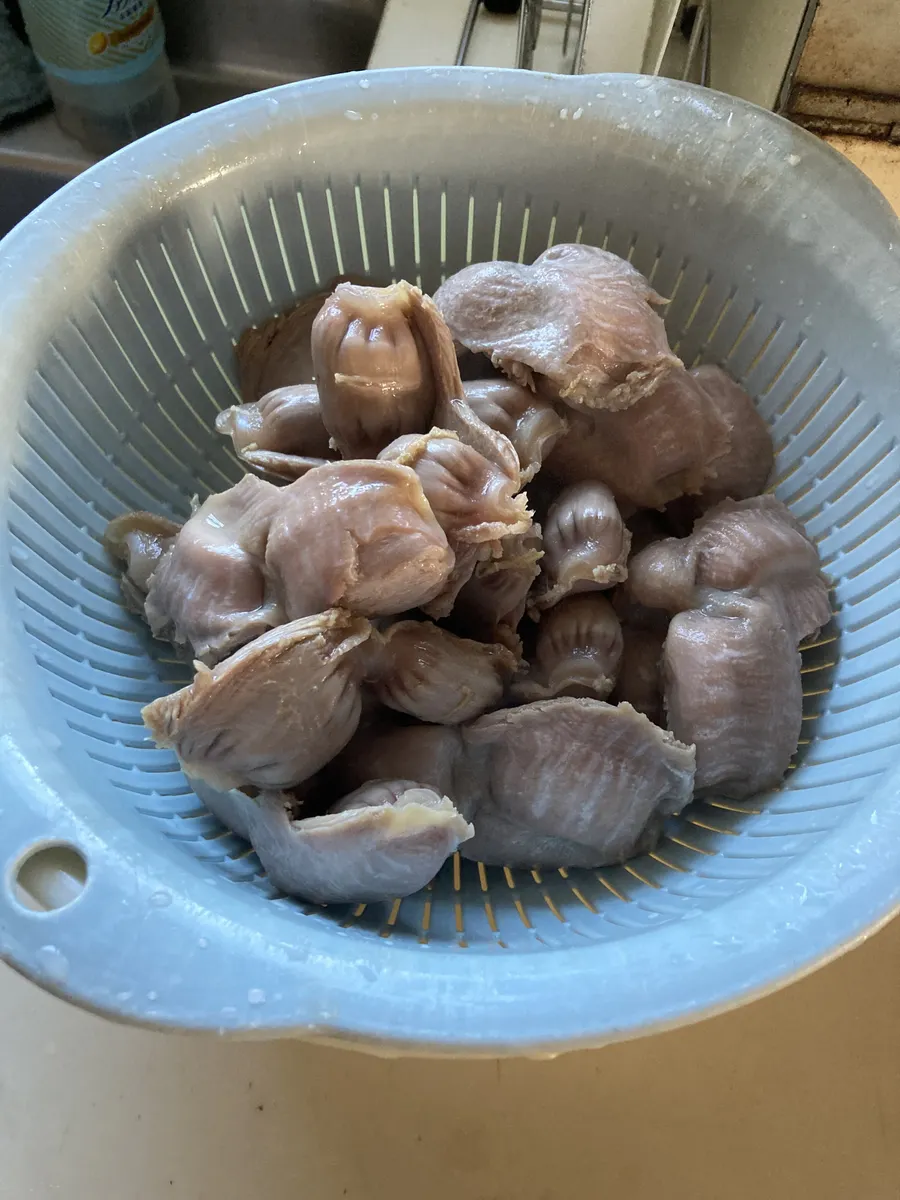 未処理の砂肝を5分ほど茹で、水洗い。半分に切って、両端の硬い部分を丁寧に切り落とし、さらに口の中でモゾモゾ何回も噛むより歯ごたえを楽しみたいので半分に切る。