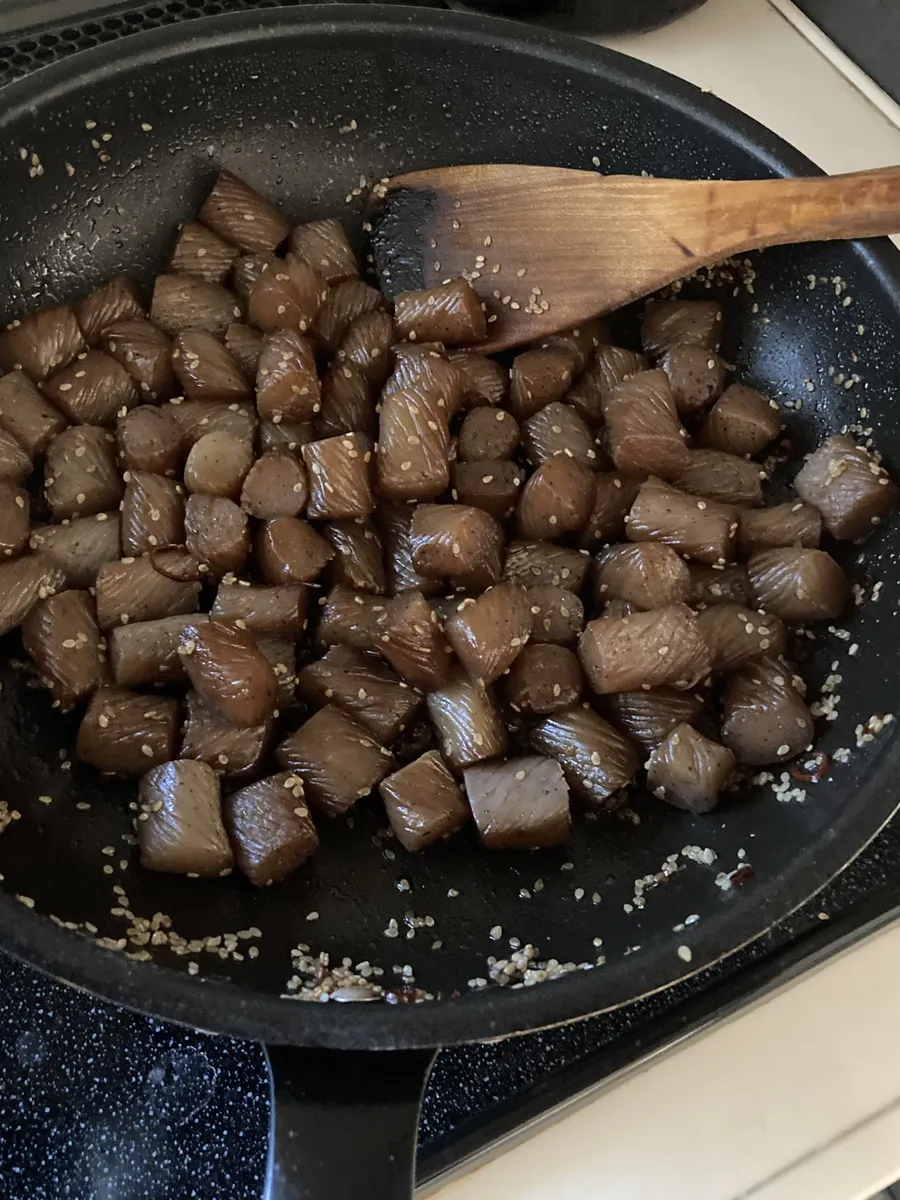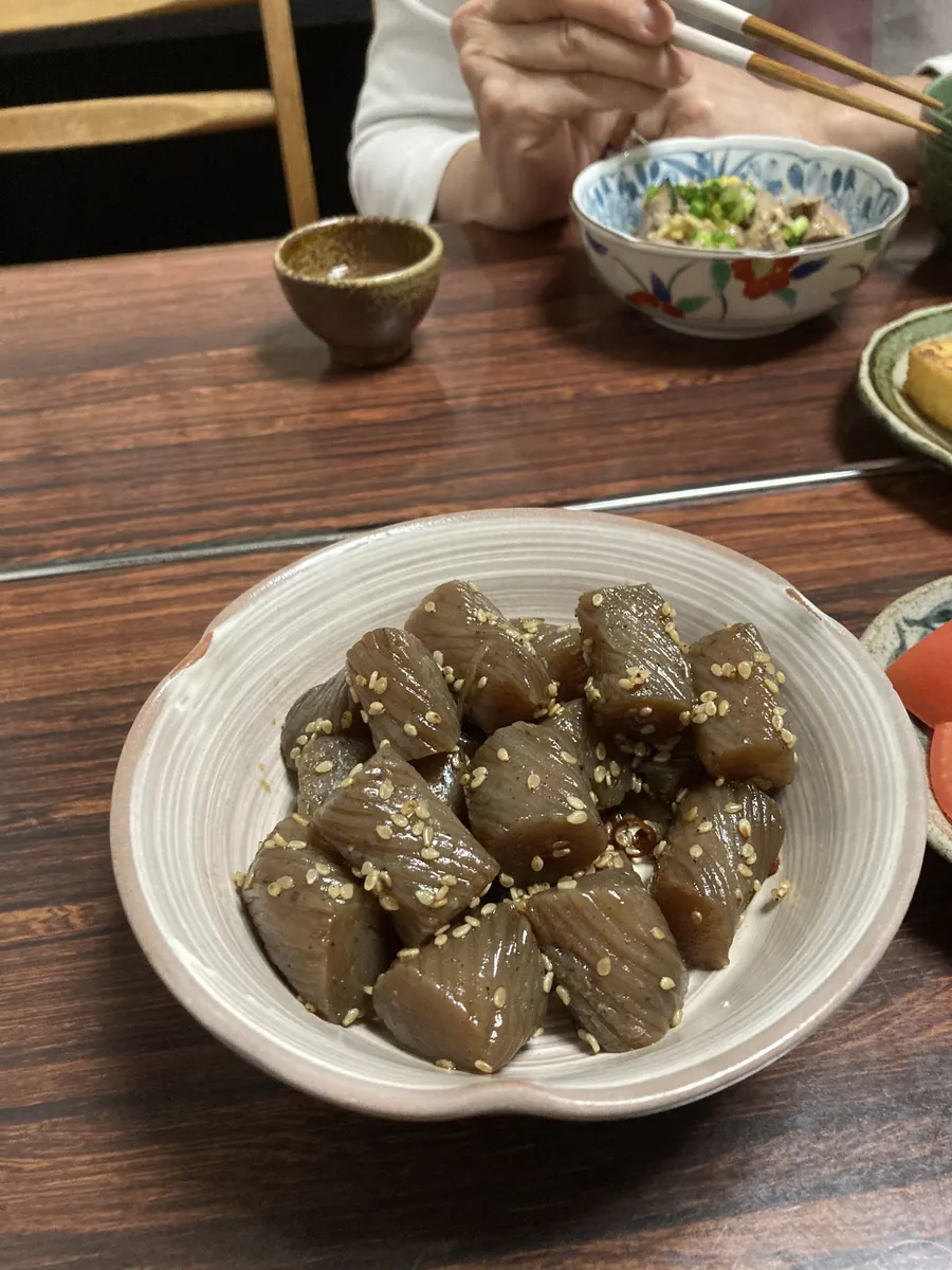 下処理した砂肝を食前にみじん切りの長ネギとポン酢等に混ぜるだけ。嫁さんがこんにゃくの甘辛煮を食べたいと言うので、並行して大量に作りましたわ😎