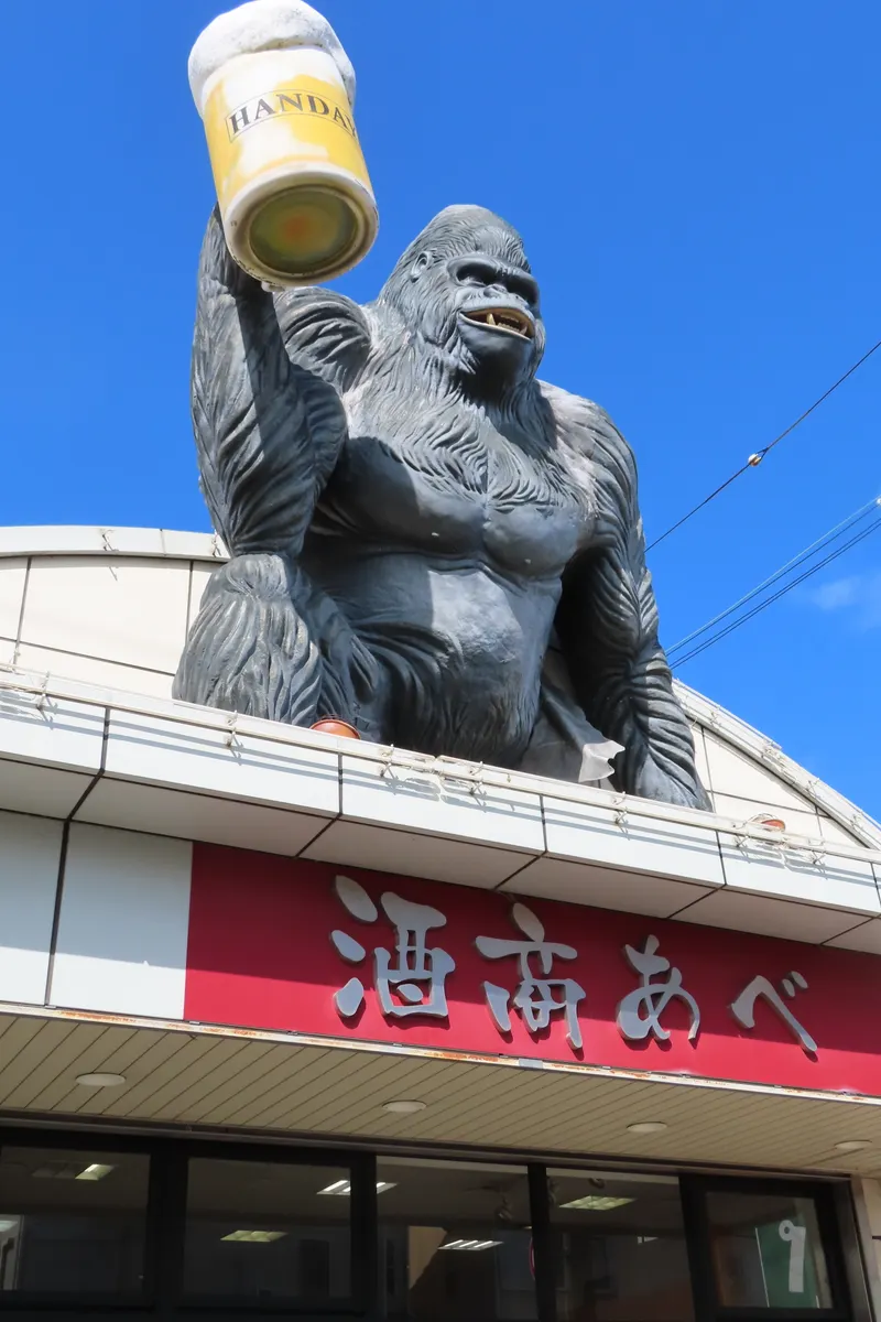 缶ビールを掲げるキングコング 東貝塚駅近くの酒屋