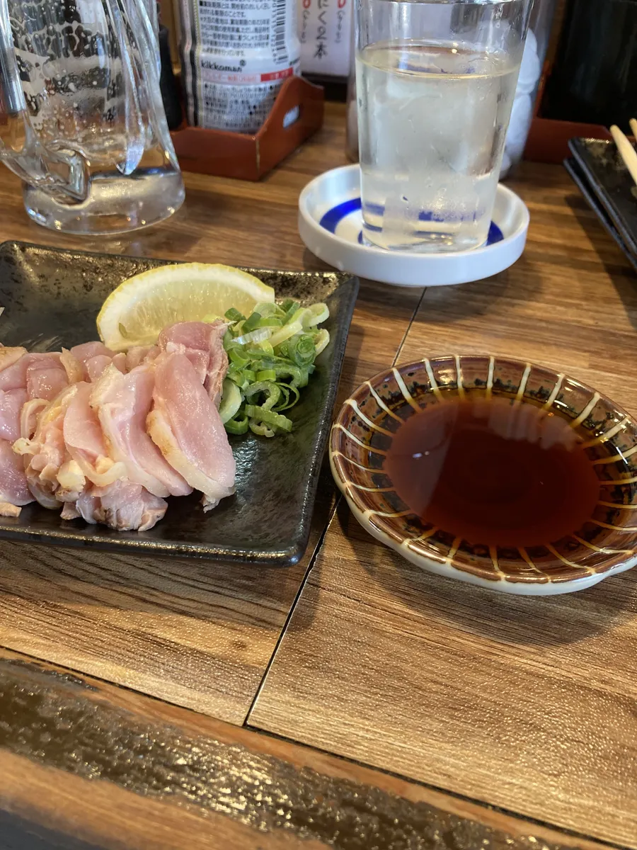 続いて鶏もものタタキを肴に冷えた地酒をグビグビ