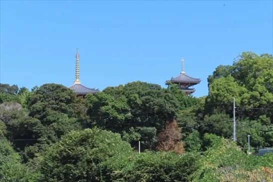 長慶寺の形式の異なる二塔の三重塔を遠望