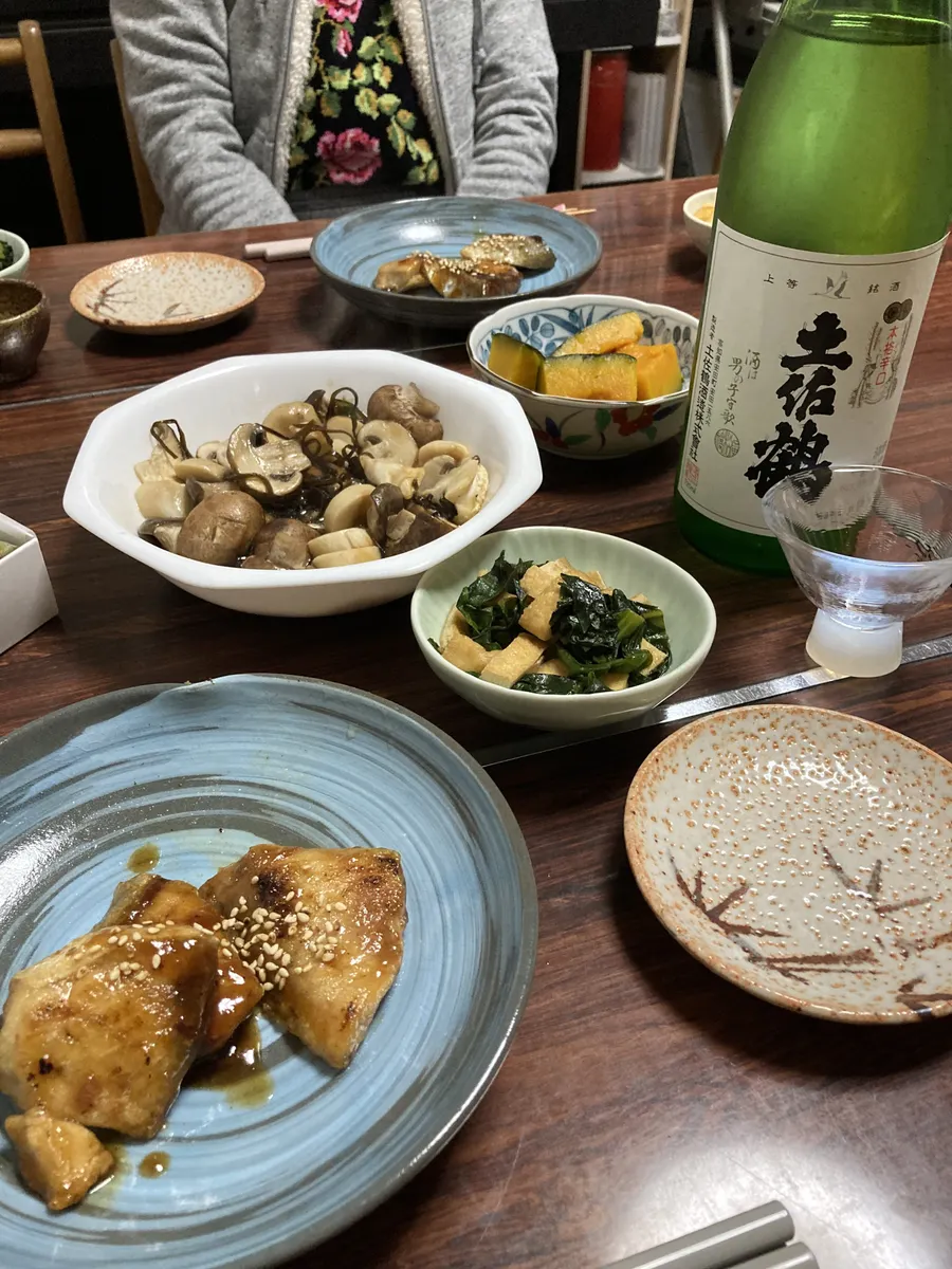 ブリの梅照り焼き、小松菜と京揚げノ煮浸し、マッシュルームとエリンギの塩昆布和え、カボチャにもの大根の醤油漬け!