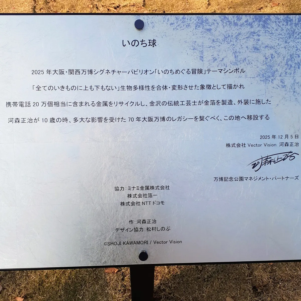 トップ > ファンでん写真館 > お出かけスポット・プラン > いのち球 はる 2025/12/08 10:36 いのち球 昨日民博へ行ってきました。 万博公園内を歩いていると、夢洲から移設された「いのち球」がありました。 すぐ近くには、70年万博のイサム・ノグチの「月の世界」の球体が残されています。(写真を撮れば良かった。) 公園内には、70年の万博遺産が色々残っているようなので、次行った時は遺産巡りをしょうと思っています。 続 万博新旧 万博記念公園 いいね 共有する 共有する X facebook LINE リンクをコピー コメントする 0 件の返信 (新着順)
