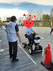 ダイハツ万博モビリティ 横山万博の座席引き換えが祭り広場で、東ゲートから遠いのでモビリティの貸し出しを訊くと、混雑してるので貸し出せず試乗体験ならできるという事でした。そこで西ゲート近くの施設へ行くとすぐ案内され、まず乗り方のレクチャーがありました。アクセルとバックのボタンの位置、足は必ずカート内にと注意事項説明がありまし
