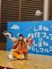 石見神楽 万博で見た石見神楽が素敵だったので、また見たくて島根のイベントに参加しました。題目は恵比須様が鯛を釣る構成で、お囃子に合わせて最後は飴まきで盛り上がりました。後で演者がお面を外して登場され、京都の大学時代に石見神楽に興味を持ち、その後移住して仕事の合間に石見神楽の修行をしてるとの事。日本の伝統文化を