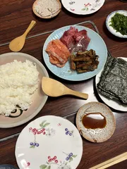 今夜は久しぶりに手巻き寿司!暖かい部屋の中で自由に巻いて腹いっぱい寿司を食べるぞ😋マグロと大葉を巻きます!次はサーモン!次はうなぎと大葉!