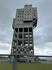 九州船旅マイカー旅 福岡(板付)空港のほど近く、なにやらこのようなコンクリート造の建物?が。これも福岡の産業遺産、福岡県志免町にある旧志免鉱業所竪坑櫓。この周辺にも糟屋炭田といって筑豊とはまた違った炭田が広がっていますが、もうすでに閉山。このすぐ裏側には三連のボタ山がそびえています。竪坑櫓が築造されたのが、昭和18年(
