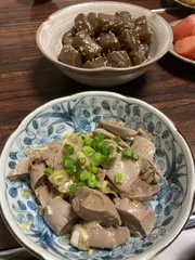 歯ごたえのいい砂肝を食べたくなった。ニンニクピリ辛炒めも美味いが、今夜は居酒屋メニューの『砂肝ネギポン酢』に。 未処理の砂肝を5分ほど茹で、水洗い。半分に切って、両端の硬い部分を丁寧に切り落とし、さらに口の中でモゾモゾ何回も噛むより歯ごたえを楽しみたいので半分に切る。下処理した砂肝を食前に