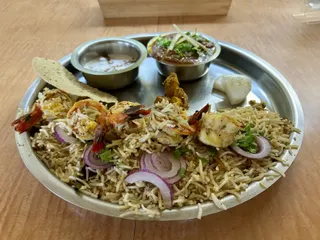 海老ビリヤニランチ カレー系自体いただくのは本当に久しぶりでした。いつものお店、西宮市のアカーシュさんで、海老のビリヤニをいただきました。バスマティライスのビリヤニに、別にソテーされた大きな海老が5尾も😋 そしてライタ(ヨーグルト)が添えられています。ビリヤニには日替わり(手羽元カレー)か月替わりのカレー(スパイシーキ