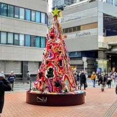 蓮沼千紘さんの作品 今年のNu茶屋町のツリーは、ニットアーティストの蓮沼千紘さんの作品です。ツリーが風邪をひかないように、セーターを着ている感じです。暖かい雰囲気があり、カラフルなので元気も貰えそうです。