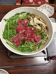 友人を招いての鍋料理! 久しぶりに昔の勤め先の同僚を招いての家飲み🍺🍺🍺準備したのは『牛肉と水菜のハリハリ鍋』🍲ハリハリ鍋はクジラ肉でするらしいが、わが家ではもっぱら牛肉。材料が牛肉と水菜だけなので準備も超簡単。醤油ベースのスープにチューブにんにくを多めに入れるのがポイント。あとはサッと煮ながら食らうだけ。〆には冷凍和そば